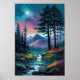 In this oil painting-style digital masterpiece, the enchantment of evening unfurls. A tranquil wilderness comes alive as a stream meanders from a serene lake, embraced by the lush canopy of a surrounding forest. Majestic mountains stand sentinel in the distance, while the fading sun adds its golden touch to a scene of timeless beauty.