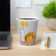 Oil painting print of a still life of a yellow wildflower and two oranges.