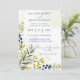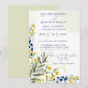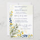 This wedding invitation features an elegant and floral design with watercolor-style yellow and blue flowers along with green leaves decorating the sides.