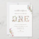 This editable girl's wildflower 1st birthday party invitation sets the tone for your wildflower theme birthday celebration. The RAYEN Collection features a white background with the number one spelled out in floral letters, and a few wildflowers framing the edges of the floral letters birthday. A pairing of script and serif fonts in tree bark brown with all editable text completes this floral wildflower first birthday party invitation for a girl.