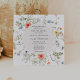 Wedding invitation featuring a watercolor frame of wild flowers and greenery. Customise with your information.