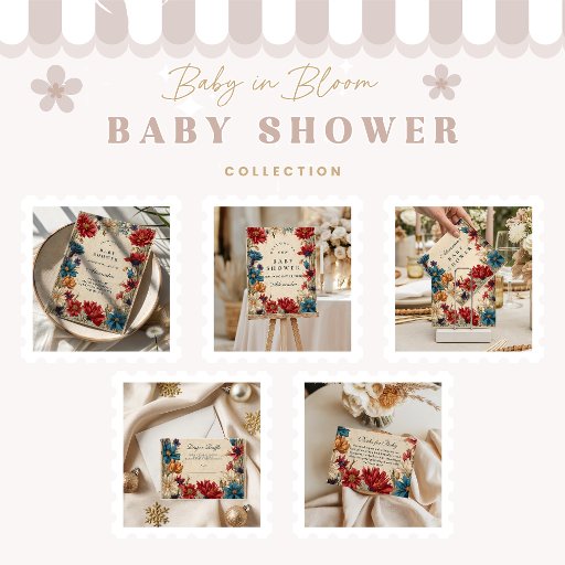 Celebrate new beginnings surrounded by the charm of nature. This design features hand-painted wildflowers in vibrant red, blue, and cream tones, evoking the beauty of a rustic meadow in full bloom. Perfect for boho, country, or outdoor-themed baby showers.