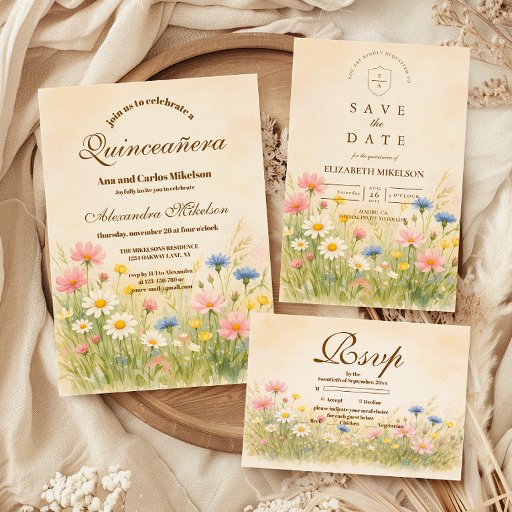 A joyful meadow of watercolor wildflowers blooms along the base of this elegant quinceañera design. Soft blush cosmos, delicate white daisies, buttery yellow blossoms, and airy blue florals rise against a warm parchment background, creating a fresh garden feel with timeless charm. Refined gold typography adds a graceful, celebratory touch while keeping the composition light and balanced. Perfect for a quinceañera celebration filled with romance, color, and countryside elegance.