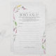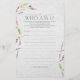 Modern, elegant bridal shower game "Memory Lane - Who AM I?" featuring watercolor wildflower motifs in soft shades of blush pink, lilac and lavender, yellows, blues and delicate green botanical leaves. Personalise your questions in soft off-black, accented with beautiful modern hand lettered calligraphy. Part of a co-ordinated suite. View suite here: https://www.zazzle.com/collections/elegant_wildflower_watercolor_floral_bridal_shower-119635760261893795 Contact designer for matching products. Copyright Anastasia Surridge for Elegant Invites, all rights reserved.