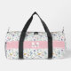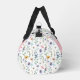 Add a soft, colorful touch to your everyday essentials with this elegant duffle bag featuring a delicate wildflower pattern in pastel shades of pink, purple, blue, yellow, and green on a clean white background. The design is printed on both of the large main sides of the bag, each featuring a pink bar with a white and gray monogram for a graceful, personalized look. The wildflower pattern continues onto each end of the duffle for a cohesive, polished design.