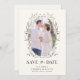 Elegant and stylish, this photo save-the-date announcement card features gorgeous dainty hand-painted watercolor pink, purple, and blue pastel wildflowers and sage greenery with a cute white butterfly arranged in a lovely vintage wreath on an ivory background. The back includes a beautiful matching bouquet with the bride and groom's monogram and an optional wedding website.
