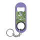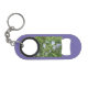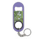 A Stainless Steel Bottle Opener with a Picture of Wildflowers on it, colour purplebackground.