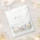 Wildflower wedding favour bag that features pretty floral graphics in soft blue, blush, yellow, white and green tones and a modern font. The meadow flower design is perfect for a spring or summer wedding or event. Pair with anything in the ELODIE collection for a cohesive look.