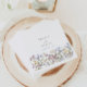 Wildflower wedding paper napkins that feature pretty wildflower graphics, a soft blush pink, blue, lilac, yellow and green colour palette and a modern font. The stylish design is perfect for a wildflower-themed summer wedding. Pair with anything in the ELODIE collection for a cohesive look.