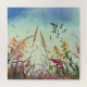 A beautiful scene of vibrant and colourful wildflowers in the wind set in front of a blue and green sky with stars.
