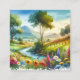 A vibrant springtime valley bursts with colour in this scenic watercolor landscape, where blooming wildflowers dance along a winding stream beneath tall trees and soft golden light. Rolling hills and distant mountains fade gently into the background, evoking the quiet joy of countryside mornings. Delicate floral hues and painterly textures bring a sense of harmony, warmth, and rustic charm, perfect for adding natural serenity to any space. AI generated artwork.
