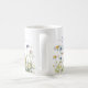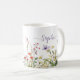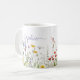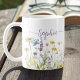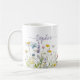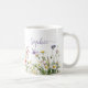 Custom script personal name Coffee Mug. A meadow full of watercolor wildflowers, butterflies and dragonfly. The name on both sides is in a peach script font with attached swirls/glyph on each side of the name for a feminine touch. You can keep them or delete. Try to write your name between the square icons and see before you decide.