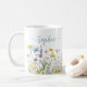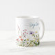 Custom script personal name Coffee Mug. A meadow full of watercolor wildflowers, butterflies and dragonfly. The name on both sides is in a peach script font with attached swirls/glyph on each side of the name for a feminine touch. You can keep them or delete. Try to write your name between the square icons and see before you decide.