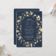 A boho wedding invitation with a modern touch. A wildflower floral soft pink and pale yellow double arch frame surrounds the wedding information over a navy background. On the back there is template spaces to add details and QR code for your guests to scan and RSVP on your website. Great for spring, summer of fall.