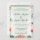 A contemporary and elegant floral wedding invitation featuring a beautiful wildflower watercolor arrangement in a white, green, and orange colour palette complemented with a modern calligraphy font for a romantic yet stylish look.
