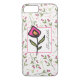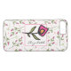 A phone case with your customised name and pretty pink flower inside a square frame with a pink border. The background is a pattern with hand drawn pink wildflowers with long green stems and leaves on a eggshell white coloured background. Pink circles and sprigs also decorate the design. Whimsical and pretty floral design.
