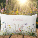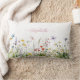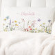 Custom pink script personal name Pillow. A meadow full of watercolor wildflowers, butterflies and dragonfly. The name on both sides is in a pink, feminine script font with attached swirls/glyph on each side of the name. You can keep them or delete. Try to write your name between the square icons and see before you order.