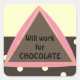 A fun design featuring a chocolate brown triangle with a pink border. Says 'will work for chocolate' a background of dark chocolate with white polka dots.