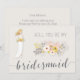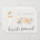 Will You Be My Bridesmaid cards with blonde girl in white wedding dress, beautiful pink floral bouquet and custom grey text, where you can add your and Bridesmaids name