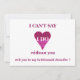 This 5" x 7" beautiful Will you be my bridesmaid? invitation card. This is best for the bride. If you looking at asking someone to be yourbridesmaid for your future wedding, then why not choose this bridesmaid cards. This customised invitation card will make your friend, sister cousin, nephew, daughter or whoever else you choose feel that extra special. This invitation is easily personalised by clicking on the customise it button under the image where you will be able to change the text, font and size. You can invite your best buddies in style with these classy invitations. It is suitable for the flower girl,maid of honour or for matron of honour. Send them this bridesmaid card.