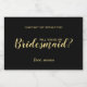 featuring wording "Will You Be My Bridesmaid?" in gold modern script font style with details in gold modern sans serif font on black background.