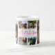 Modern bridesmaid gift mug featuring a 6 photo collage template, the word "will you be my bridesmaid?" in a cute pink gradient font, and a text template for you to personalise.