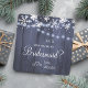 Personalised will you be my bridesmaid | maid of honour | flower girl editable text card featuring rustic white snowflakes and shimmering hanging string of lights on dark blue grey barn wood background. Ideal for your winter elegant rustic country | wonderland themed wedding.