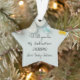 Will you be my Godmother Christmas star hanging tree ornament with baby items. Add godfather's and baby's name. Has Christmas year on back.