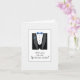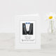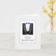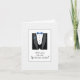 Will you be my groomsman? When it is time to invite your wedding party, this card is the perfect way to begin. A black tuxedo with blue tie and lapel flower in front of a light grey striped background. Such a handsome card to begin your wedding process with your groomsman request!