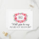 A pastel pink and red filled rose wreath has forest green leaves and buds that frame the bridal couples monogram and templates below that ask your bff to be your bridesmaid. Special thanks to smelltheroses(dot)com for her beautiful illustrations.