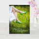 A bride sits with crossed legs in her lovely bridal gown and shoes among a grassy meadow on this invitation to request your Matron of Honour.