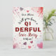 This quirky and playful Valentine’s Day card features the witty phrase, "Will You Have a Q1nderful Love Story with Me?" on the front, adding a touch of humour to your heartfelt message. The background is adorned with soft, watercolor hearts, creating a gentle and romantic vibe. Personalise the card with your loved one's name for a special, customised touch, and add your own signature "Love, [Your Name]" on the back. Perfect for couples who enjoy a fun, clever twist on traditional Valentine's Day cards.