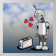 Artist Thomas combines graphic and photographic elements to produce this portrait of a love-stricken robot and the bread-browning object of his desire. The robot is a caricature of his son Jules (if he were an animatron). The binary code in the background is a translation of the lyrics of a great song about robots by a funny band from New Zealand.