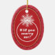 This Christmas tree ornament features a marriage proposal theme. The background is red with a light red heart pattern, the centre features a white circle with a snowflake on top to represent a diamond right, inside the ring is the text: Will you marry me? The backside features customisable text for you to add a message and your name.