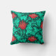 Throw pillow in a vintage William Morris floral damask pattern of anemone flowers and leaves, digitally enhanced and coloured - turquoise / peacock leaves, and flowers in shades of deep red and coral on a dark teal green background