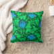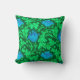 Throw pillow in a vintage William Morris floral damask pattern of anemone flowers and leaves, digitally enhanced and coloured - emerald green leaves, and flowers in shades of cerulean and cobalt blue on a dark emerald green background