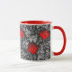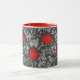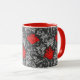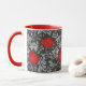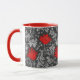 Coffee mug in a vintage William Morris floral damask pattern of anemone flowers and leaves, digitally enhanced and coloured - light silver grey / grey leaves, and flowers in shades of deep lipstick red on a dark graphite grey background