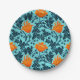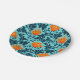 Paper plates in a vintage William Morris floral damask pattern of anemone flowers and leaves, digitally enhanced and coloured - deep indigo blue leaves, and flowers in shades of coral orange on a light chambray blue background