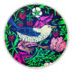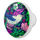 Ceramic knob in a William Morris Art Nouveau tile pattern- a bird in soft grey and cobalt blue, with fuchsia pink flowers, green leaves, and wild strawberries, against a dark indigo / navy blue background
