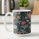 A beautiful, intricate William Morris floral pattern coffee mug featuring stylized flowers in salmon, teal, yellow, and cream against a deep navy background. Perfect for adding timeless Arts Crafts decor style to any kitchen or office. This classic, rich design is ideal for fans of historic textile prints. Created by Simply Farmhouse Press.