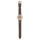 Watch in a vintage William Morris, Art Nouveau, floral print of stylised chrysanthemums, digitally enhanced and coloured, in tan, rust terracotta, and coral, on a deep chocolate brown background