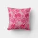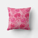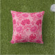 Outdoor pillow in a vintage William Morris, Art Nouveau, floral print of stylised chrysanthemums, digitally enhanced and coloured, in shades of deep fuchsia pink, azalea pink, and burgundy, on a pale pink background