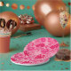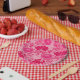 Paper plates in a vintage William Morris, Art Nouveau, floral print of stylised chrysanthemums, digitally enhanced and coloured, in shades of deep fuchsia pink, azalea pink, and burgundy, on a pale pink background