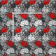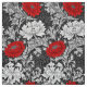Fabric in a vintage William Morris, Art Nouveau, floral print of stylised chrysanthemums, digitally enhanced and coloured, in shades of silver grey /grey and white, accented with deep red, on a dark graphite grey background