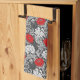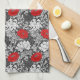 Kitchen towel in a vintage William Morris, Art Nouveau, floral print of stylised chrysanthemums, digitally enhanced and coloured, in shades of silver grey /grey and white, accented with deep red, on a dark graphite grey background