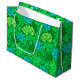 Large gift bag in a vintage William Morris, Art Nouveau, floral print of stylised chrysanthemums, digitally enhanced and coloured, in light and deep lime green and aqua, on an emerald green background