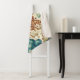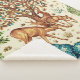 Sherpa Blanket in a William Morris tapestry design of three deer beside a brook in a fantasy forest setting of trees in shades of soft green and aqua, against a beige background