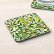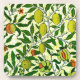 Coasters in a William Morris Art Nouveau pattern of lemons, pomegranates, and peaches, with blossoms, on leafy branches - fruit in yellow and coral orange, with green leaves, against a patterned, yellow and white background