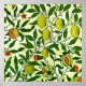 Print in a William Morris Art Nouveau pattern of lemons, pomegranates, and peaches, with blossoms, on leafy branches - fruit in yellow and coral orange, with green leaves, against a patterned, yellow and white background