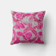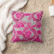 Throw pillow in a William Morris Art Nouveau textile pattern, digitally enhanced and coloured - stylised peonies and leaves in shades of deep fuchsia pink, burgundy, and graphite grey, against a light silver grey / grey background